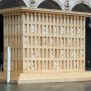 De Lucchi ha ideato per Safilo, brand nato negli anni ‘30 e da sempre leader nella produzione di occhiali da vista, una struttura in legno di abete naturale con finestre (seguendo il modello di una delle sue casette scolpite con la motosega), la cui concezione rimanda a una gipsoteca, che presenta esternamente dei bassorilievi di gesso - creati ad hoc dal laboratorio milanese Fumagalli e Dossi, che realizza ancora i calchi secondo procedimento tradizionale - raffiguranti volti, mani e nasi. Ciascuno regge un paio di occhiali, elementi contrastanti e spiazzanti, che riportano la mente all’oggi, attraverso cui si può scoprire cosa nasconde al suo interno la struttura.