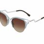 Un mix di materiali diversi che si fondono per dar vita ad una moderna forma architettonica: la silhouette cat-eye di ispirazione retrò realizzata in Optyl – marchio che contraddistingue un materiale plastico leggero e dalle straordinarie finiture cromatiche – è sottolineata da linee morbide, dolcemente arrotondate e impreziosita da cristalli piramidali in formato oversize che incorniciano le lenti, per un effetto magnetico e accattivante.