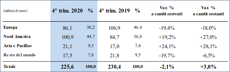 Vendite nette €225,6M vs €230,4M nel 4° trimestre 2019, +3,0% cambi costanti/-2,1% correnti