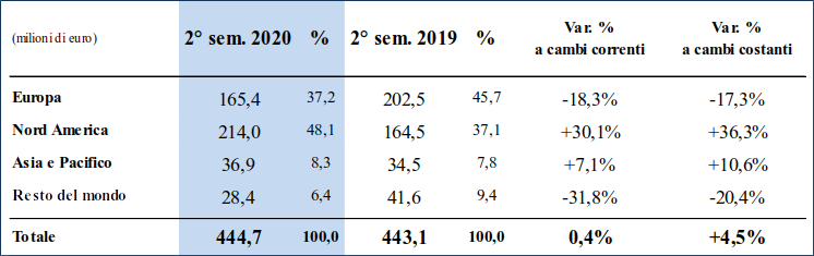 Andamento delle vendite nette del Gruppo per area geografica nel 2° semestre 2020: