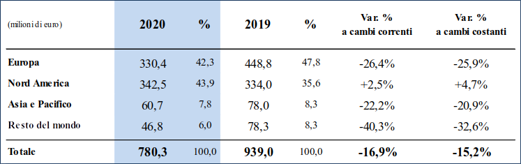 Vendite nette €780,3M vs €939,0M nel 2019, -15,2% cambi costanti/-16.9% correnti