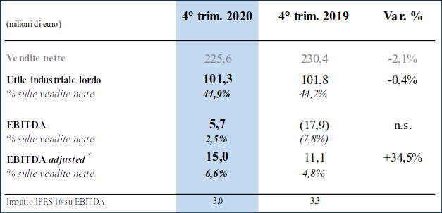 La performance delle vendite nel 4° trimestre ha consentito al Gruppo di proseguire il percorso di recupero degli utili iniziato nel 3° trimestre e di registrare nel periodo un EBITDA adjusted3 positivo pari a 15,0 milioni di euro, in crescita del 34,5% rispetto agli 11,1 milioni di euro nel 4° trimestre 2019. Nel 4° trimestre 2020, il margine EBITDA adjusted 3 è aumentato al 6,6% delle vendite dal 4,8% registrato nel 4° trimestre 2019, segnando un miglioramento di 180 punti base grazie principalmente alla migliore leva operativa del periodo.