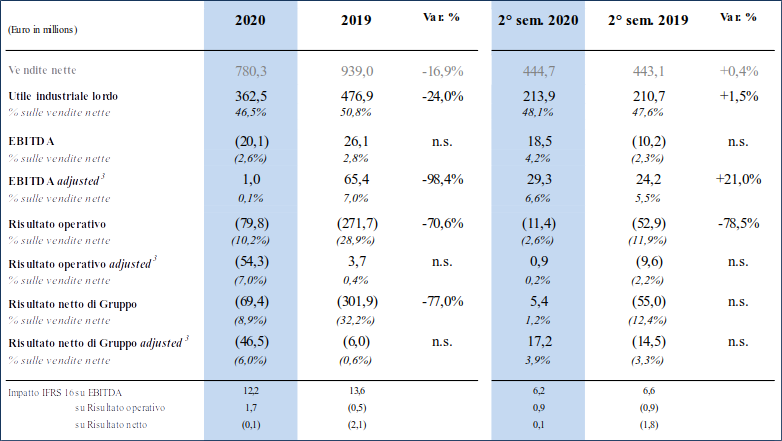 Nel 2020, le nostre vendite nette sono diminuite del 15,2% a cambi costanti e abbiamo chiuso l’anno con un livello di EBITDA adjusted 3 leggermente positivo, il tutto a fronte del significativo calo subito nella prima metà dell'anno a causa degli effetti della pandemia da Covid-19, seguito dalla solida ripresa delle vendite nel secondo semestre dell'anno, e dai nostri decisi interventi sulla struttura dei costi. Nel 2020 abbiamo realizzato 15 milioni di euro di risparmi strutturali sui costi generali, realizzando la maggior parte dei 20 milioni previsti nel nostro Piano a medio termine, a cui si è aggiunto un uso efficace delle misure di sostegno messe a disposizione dai diversi governi durante questa pandemia.