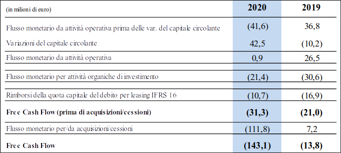 Nel 2020, il cash flow per investimenti sul business organico è stato pari a 21,4 milioni di euro a fronte di investimenti di 30,6 milioni di euro nel 2019.